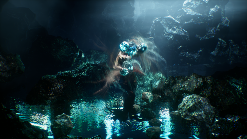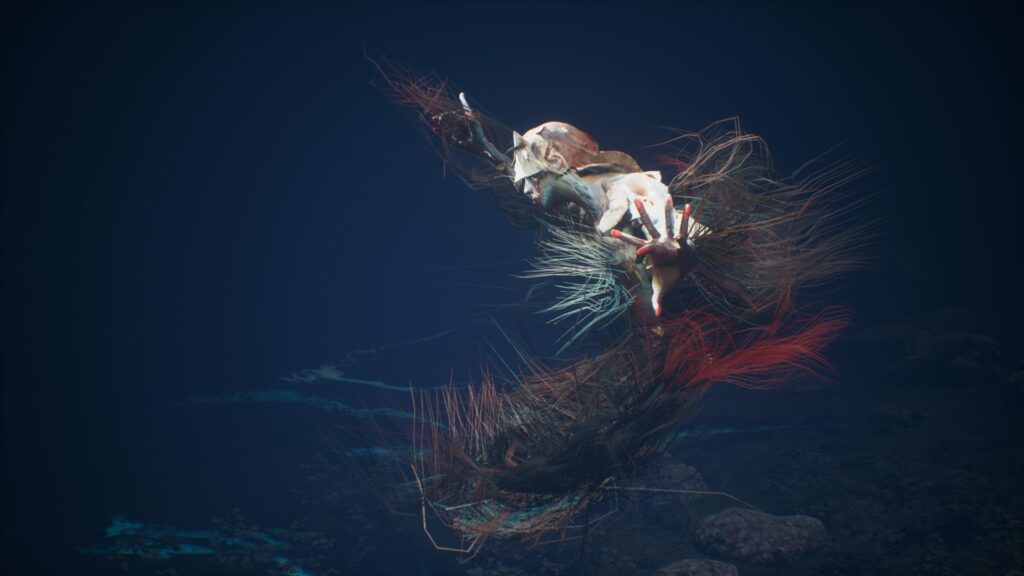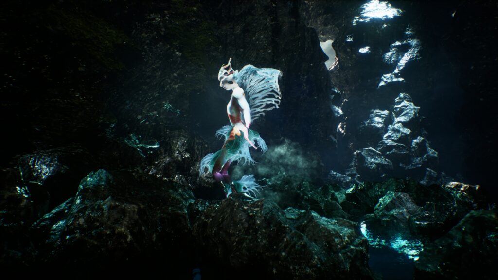 A branch from Yiou Wang’s art-tech lore about water, “Aqua Limina” is a neo-mythic video game and a piece of new media lore which allows visitors to explore the storied landscape of a river. Entering the world, you ascend a procession upstream toward the river’s source, encountering voices and reincarnations of spirits along the way, making connections that may guide the player towards possible becoming, a narrative that parallels shamanic “spirit mediumship.” The term “avatar” came from Sanskrit, originally meaning a reincarnation of a deity. In such an ancestrally derived, expanded concept of the human or non-human person, consciousness is already fluid and we can transform into other beings infinitely. These spirits are brought to life by a blend of traditional CGI and motion capture techniques, motion capture by Alina Tofan and sound by Yuj Archetype, whose forms often reference structures of hydromythological origins as well as anatomy derived from contemporary performance research. Set in a cosmos where the river is not a resource nor an adornment but a densely inhabited spiritual collective, Aqua Limina transports visitors to an ancient future myth offering a counter-paradigm to modern techno-rationalism and human-centric ideology.