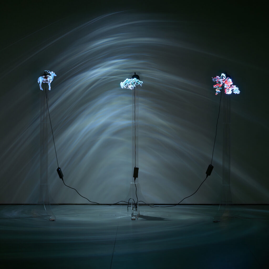Created as a child of Yiou and Meichun’s holographic universe mixanthropy.com, Mixanthropy: Animorphosis (Holographic fan, acrylic, light. 2025) is a trilogy of midair, transparent holograms suspend hybrid bodies that continuously morph among human, animal, and chimera. Each avatar performs a choreographic score motion-captured from the two artists’ movement practice of “inhabiting” nonhuman anatomies to drive visual deformation.